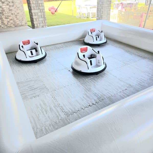 Our bumper car rental package includes three mini bumper cars and a white bumper arena. The white arena adds a touch of elegance to the setup and creates a visually stunning atmosphere for the party. It's the perfect backdrop for capturing memorable moments with friends and family.